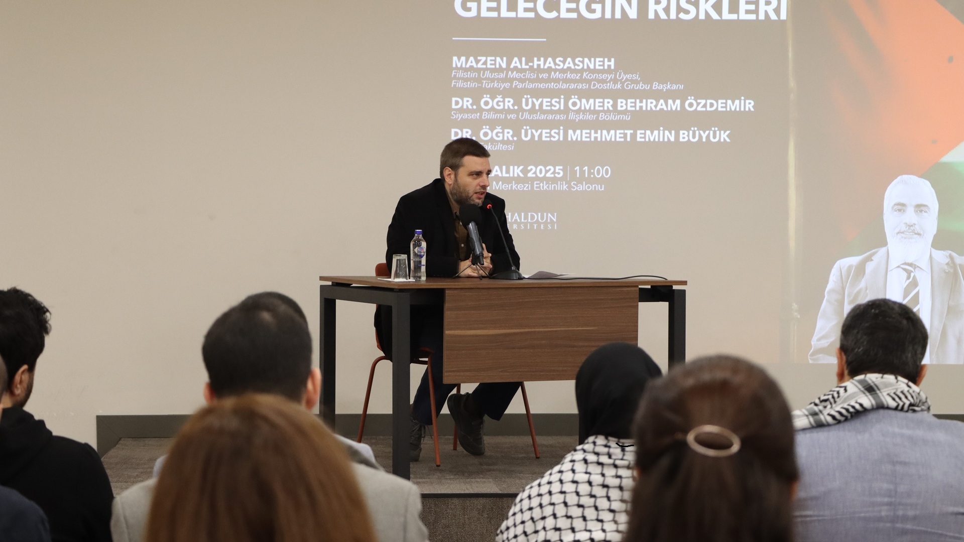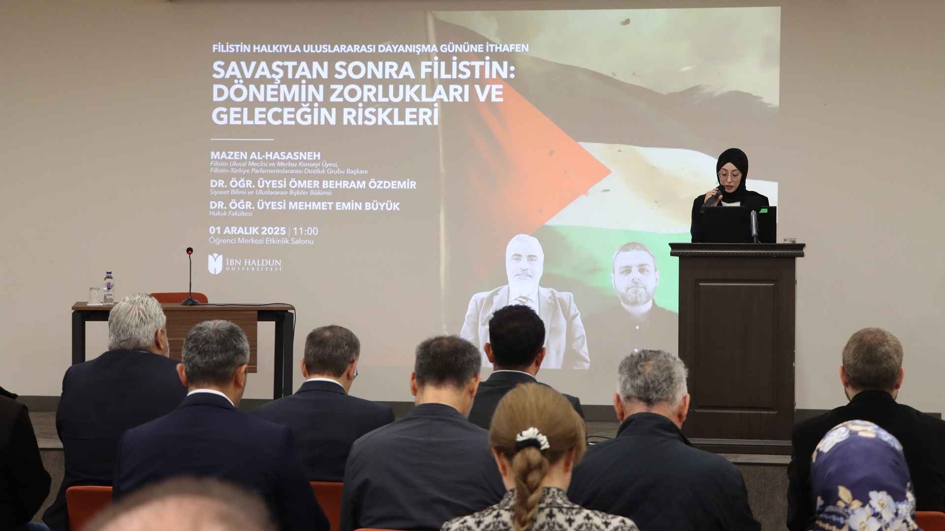 İbn Haldun University held a conference titled “Palestine After the War: Current Challenges and Future Risks” on Monday, December 1st at 11:00, as part of the International Day of Solidarity with the Palestinian People. The conference featured Mazen Al-Hasasneh, Member of the Palestinian National Council and Central Council, and Chair of the Palestine–Türkiye Interparliamentary Friendship Group, as well as our faculty members Assist. Prof. Ömer Behram Özdemir from the Department of Political Science and International Relations and Assist. Prof. Mehmet Emin Büyük from the Schoolof Law. The speakers addressed the current situation in Palestine from moral, political, and legal perspectives within an international context.
