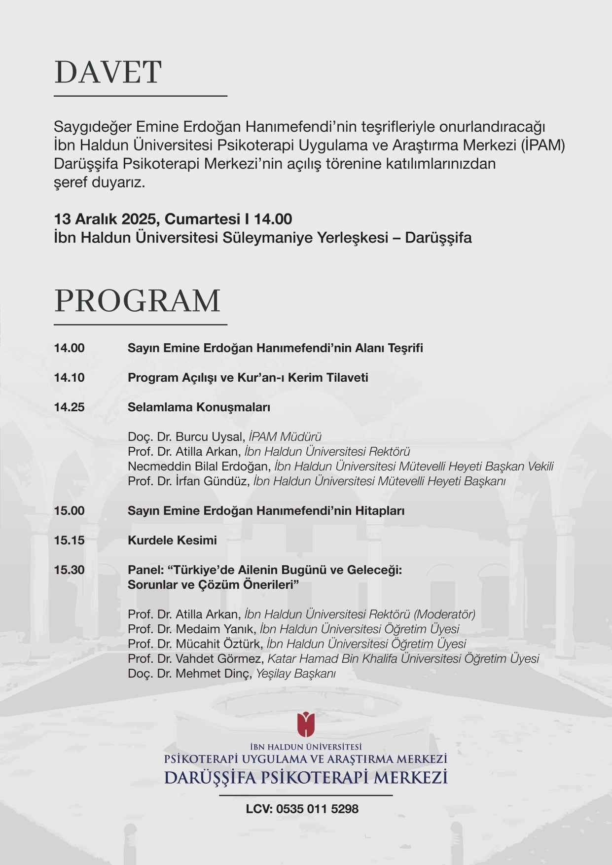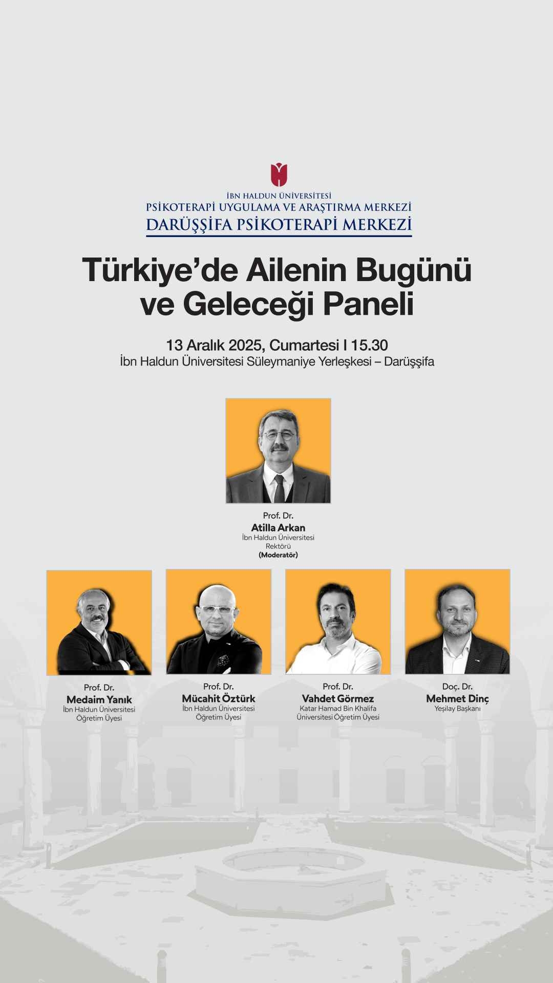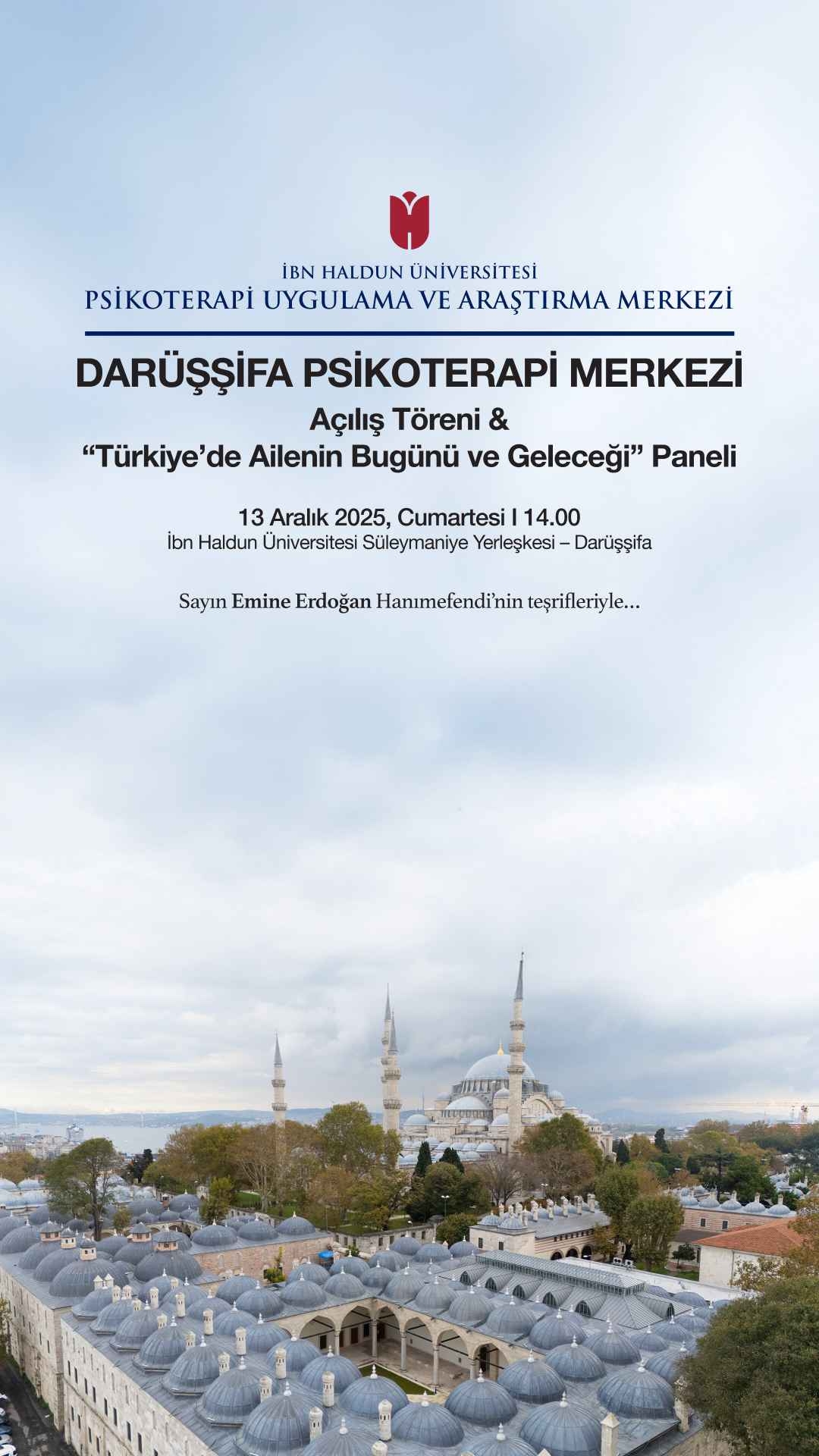 13 Aralık 2025 Cumartesi günü saat 14:00’da İbn Haldun Üniversitesi Süleymaniye Yerleşkesi/ Darüşşifa’da gerçekleştirilecek olan programda ayrıca “Türkiye’de Ailenin Bugünü ve Geleceği” Paneli düzenlenecek. Rektörümüz Prof. Dr. Atilla Arkan’ın moderatörlüğünü yapacağı panele; üniversitemiz öğretim üyeleri Prof. Dr. Medaim Yanık ve Prof. Dr. Mücahit Öztürk ile Katar Hamad Bin Khalifa Üniversitesi Öğretim Üyesi Prof. Dr. Vahdet Görmez ve Yeşilay Başkanı Doç. Dr. Mehmet Dinç katılacak.