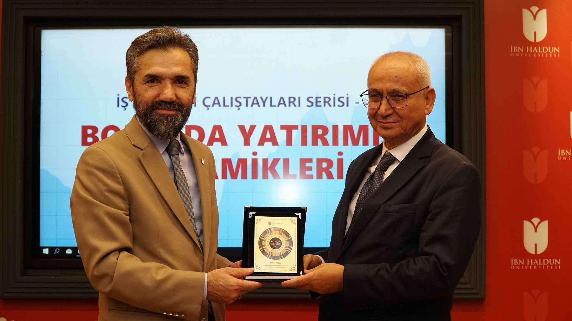 Birlik olarak sermaye piyasalarının geliştirilmesine dönük önerilerini de sıralayan Erhan Topaç, bunları şöyle sıraladı: “Sermaye piyasası stratejik sektör olarak belirlenmeli ve en üst düzeyde sahiplenilmeli. Yurt içi tasarrufların artırılması ve sermaye piyasası yoluyla yatırıma yönlendirilmesi desteklenmeli. Reel sektörün finansmanında sermaye piyasasının kullanılması desteklenmeli. Yatırım bankacılığı modeli desteklenmeli ve geliştirilmeli. Rekabetçi ve cazip bir finansal ekosistem yaratılmalı.” Erhan Topaç, sermaye piyasalarının tüm dünyada önem kazandığını, Türkiye’de kredi ve sermaye piyasalarının dağılımın dengeli olmayıp riskin bankacılık üzerine yoğunlaşmış durumda olduğunu ve bu yoğunluğun giderek arttığını, mevcut ekonomik ortamda bir rahatlama ve iyileşme için riskin sermaye piyasalarına dağıtılmasını gerektiğini söyleyerek konuşmasını sonlandırdı. Açılış konuşmalarının ardından Rektörümüz Prof. Dr. Recep Şentürk, Mehmet Gönen ve Erhan Topaç’a çalıştaya katılımları ve katkılarından dolayı İbn Haldun’un “Siyaset Dairesi” temalı birer plaket takdim etti. Çalıştayda açılış konuşmaları ve plaket takdiminin akabinde, moderatörlüğünü Prof. Dr. Mustafa Kemal Yılmaz’ın üstlendiği panelde Albaraka Portföy Yönetimi Genel Müdürü Muhammed Emin Özer, İş Yatırım Uluslararası Piyasalar Müdürü Şant Manukyan, Takasbank Türev Araçlar ve Enerji Emtia Müdürü Dr. Necla Küçükçolak, Halk Yatırım Yatırım Danışmanlığı Yöneticisi Serhan Yenigün ve Phillip Capital Araştırma Direktörü Metin Taşçıoğlu konuştu. Prof. Dr. Yılmaz’ın sorularıyla yönlendirdiği panelde konuşmacılar, borsada ve genel olarak sermaye piyasalarında yatırımın dinamikleri konusunda ufuk açıcı noktalara temas ettiler.